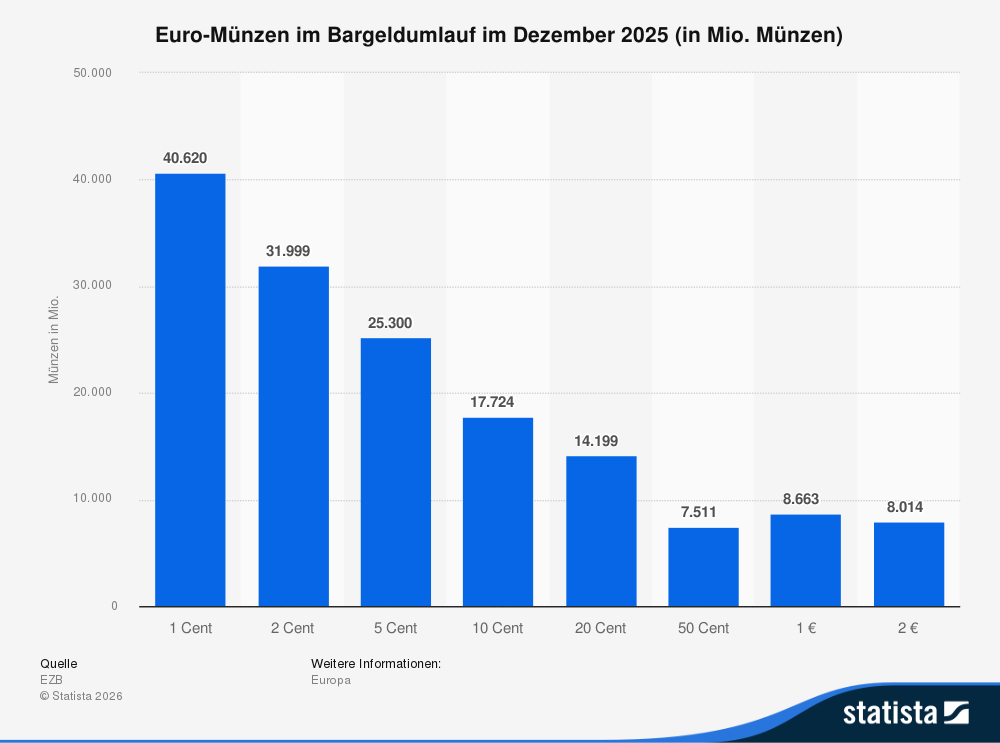 Die Bundesbank geht davon aus, dass jeder Einwohner im Durchschnitt 541 Münzen im Wert von 128 Euro besitzt. Wie aus dieser Statista-Grafik deutlich hervorgeht, sind darunter vor allem die Kleinmünzen im Wert von 1 Cent und 2 Cent vertreten: